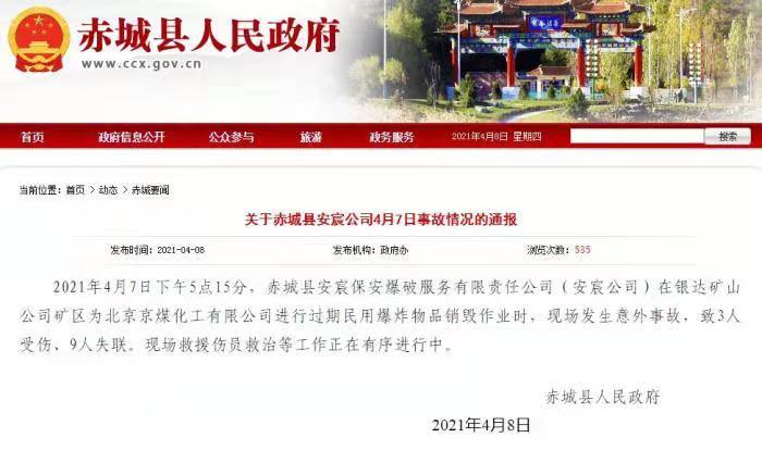 4月7日下午5點15分,赤城縣某爆破公司在銀達礦山公司礦區(qū)為北京某化工公司進行過期民用爆炸物品銷毀作業(yè)時,現(xiàn)場發(fā)生意外事故,致3人受傷、9人失聯(lián)。 3人受傷,9人失聯(lián) 這些數(shù)字足以敲響安全警鐘 4月8日晚8時許,記者從一名失聯(lián)人員親屬處了解到,失聯(lián)人員搜救工作已經(jīng)基本結(jié)束,9名失聯(lián)人員已確認遇難。 銀達礦山公司另一位工作人員證實了這一說法,“今天白天,失聯(lián)的9個人都找到了,都已經(jīng)拖走了!惫ぷ魅藛T稱,事發(fā)地離公司所在地有近十里路,他還曾嘗試到事發(fā)礦區(qū)去看一看,因現(xiàn)場有警察站崗,他沒能進入事發(fā)礦區(qū)。 目前尚不清楚這次事故的導(dǎo)火索究竟是操作步驟出現(xiàn)了問題,還是公司管理有缺陷,但是安全警鐘已經(jīng)敲響,企業(yè)和員工要提高警惕。