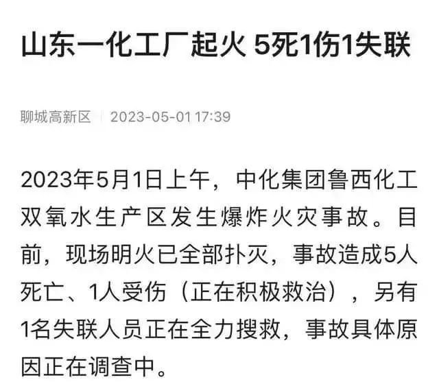 5月1日上午8點(diǎn)30分左右,有聊城市茌平區(qū)和東阿縣的網(wǎng)友忽然聽(tīng)到一聲巨響,震得門窗亂晃。隨后,網(wǎng)上傳出多段疑似魯西化工區(qū)域濃煙滾滾的視頻。 在當(dāng)?shù)匾粋(gè)區(qū)域頭條群,有很多購(gòu)買了魯西化工股票的網(wǎng)友有點(diǎn)恐慌,交流中可以看出希望這是條假消息。 據(jù)當(dāng)?shù)匾晃淮迕穹Q,聽(tīng)到響聲時(shí)他在離工業(yè)園區(qū)7公里外的東阿縣城,12點(diǎn)左右,他到現(xiàn)場(chǎng)時(shí)看到火已經(jīng)滅掉,濃煙也已止住,現(xiàn)場(chǎng)有消防車作業(yè),并有多輛救護(hù)車出入。 下午5點(diǎn)39分,據(jù)魯西化工所在地聊城市高新區(qū)官方發(fā)布,中化集團(tuán)魯西化工雙氧水生產(chǎn)區(qū)發(fā)生的爆炸火災(zāi)事故,已經(jīng)造成了5人死亡、1人受傷,另有1名失聯(lián)人員正在全力搜救。 有網(wǎng)友轉(zhuǎn)發(fā)到頭條群的山東應(yīng)急管理發(fā)布的一篇微博顯示,4月29日,聊城市應(yīng)急局局長(zhǎng)曾帶隊(duì)到魯西化工督導(dǎo)檢查“五一”假期期間安全生產(chǎn)工作,強(qiáng)調(diào)生產(chǎn)經(jīng)營(yíng)單位落實(shí)安全防范措施,在前期工作的基礎(chǔ)上對(duì)當(dāng)前安全生產(chǎn)工作再部署、再落實(shí)、再推進(jìn),嚴(yán)防各類事故發(fā)生。 事故警示信息 2023年5月1日8時(shí)36分許,山東聊城魯西化工雙氧水新材料科技有限公司1號(hào)雙氧水裝置發(fā)生爆炸,已造成重大人員傷亡。事故原因初步分析為,雙氧水裝置工作液配置釜用于回收工作液時(shí),吸入大量70%濃度雙氧水,釜內(nèi)可能存在雜質(zhì)造成雙氧水劇烈分解,引發(fā)配置釜超壓爆炸,造成現(xiàn)場(chǎng)人員傷亡,并波及相鄰企業(yè)辛醇儲(chǔ)罐及部分管線泄漏燃燒,詳細(xì)原因正在調(diào)查中。 各地區(qū)、有關(guān)企業(yè)要深刻吸取事故教訓(xùn),舉一反三,迅速落實(shí)重大隱患排查治理專項(xiàng)行動(dòng)部署,切實(shí)強(qiáng)化重大風(fēng)險(xiǎn)管控,堅(jiān)決防范遏制重特大事故。一是聚焦雙氧水工作液配置釜、氫化塔、氧化塔等重點(diǎn)部位和加氫,過(guò)氧化,工作液回收等事故易發(fā)環(huán)節(jié),強(qiáng)化隱患排查治理,落實(shí)風(fēng)險(xiǎn)管控措施。二是嚴(yán)格檢維修管理,節(jié)日期間原則上不得開(kāi)展動(dòng)火等特殊作業(yè),確需開(kāi)展的要提級(jí)管理并嚴(yán)格落實(shí)GB30871相關(guān)要求。三是嚴(yán)格限制裝置區(qū)人員數(shù)量,特別是存在爆炸風(fēng)險(xiǎn)的化工裝置區(qū)嚴(yán)禁人員聚集扎堆。 地方各級(jí)應(yīng)急部門要主動(dòng)研判本地區(qū);钒踩L(fēng)險(xiǎn),全面摸排、監(jiān)督落實(shí)安全措施;充分利用風(fēng)險(xiǎn)監(jiān)測(cè)預(yù)警系統(tǒng)在線巡查、明查暗訪、舉報(bào)獎(jiǎng)勵(lì)等手段,及時(shí)發(fā)現(xiàn)查處違法違規(guī)行為,為安全生產(chǎn)形勢(shì)平穩(wěn)提供有力保障。請(qǐng)各地區(qū)迅速將事故警示信息傳遞給有關(guān)企業(yè)。