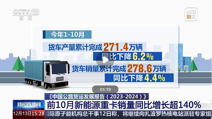 中國物流與采購聯(lián)合會(huì)今天(13日)公布《中國公路貨運(yùn)發(fā)展報(bào)告(2023—2024)》。根據(jù)報(bào)告,受運(yùn)輸結(jié)構(gòu)調(diào)整影響,我國公路運(yùn)輸占比雖有所下降,但依然是貨運(yùn)市場(chǎng)的主體,公路貨運(yùn)保持平穩(wěn)增長。 根據(jù)報(bào)告,今年前三季度,我國貨物運(yùn)輸總量為416.3億噸,同比增長2.3%。從貨運(yùn)結(jié)構(gòu)來看,鐵路與水路運(yùn)輸承擔(dān)的貨運(yùn)量占比有所提升,公路運(yùn)輸占比有所下降。前三季度公路貨運(yùn)運(yùn)輸量為306.6億噸,同比增長3.1%,占比超過73%,公路運(yùn)輸仍然是貨運(yùn)市場(chǎng)的主體。 中國物流與采購聯(lián)合會(huì)副會(huì)長 賀登才:公路運(yùn)輸是我們整個(gè)物流體系中非常重要的一個(gè)環(huán)節(jié),它的優(yōu)勢(shì)是能夠點(diǎn)到點(diǎn)、門到門,靈活性強(qiáng)。調(diào)整運(yùn)輸結(jié)構(gòu),有些環(huán)節(jié)離不開公路貨運(yùn)。除了硬件方面使用新能源車、自動(dòng)駕駛提高它的運(yùn)輸效率外,現(xiàn)在通過平臺(tái)進(jìn)行一些數(shù)字化改造,通過網(wǎng)絡(luò)貨運(yùn)平臺(tái)及時(shí)溝通供需信息。 另外,報(bào)告指出,跨境公路運(yùn)輸成為新增長點(diǎn)。2023年,我國跨境公路貨運(yùn)市場(chǎng)規(guī)模約為4500億元,同比增長12%。隨著“一帶一路”建設(shè)深入推進(jìn),便利化協(xié)定實(shí)施范圍穩(wěn)步擴(kuò)大,我國與蒙古國、俄羅斯及中亞各國的國際道路運(yùn)輸進(jìn)一步暢通,貨運(yùn)量增長明顯,逐漸形成以邊境口岸為節(jié)點(diǎn)、覆蓋周邊國家邊境地區(qū)重要城市并向腹地不斷延伸的國際道路運(yùn)輸網(wǎng)絡(luò)。 前10月新能源重卡銷量 同比增長超140% 根據(jù)《中國公路貨運(yùn)發(fā)展報(bào)告(2023—2024)》,今年1—10月,我國貨車產(chǎn)銷量累計(jì)均超過270萬輛,其中新能源重卡銷量增長明顯,同比增長超過140%。 根據(jù)報(bào)告,2023年我國貨車保有量3359萬輛,同比增長1.2%。今年1—10月,貨車產(chǎn)銷量累計(jì)分別完成271.4萬輛和278.6萬輛,同比分別下降6.2%和4.4%。 與傳統(tǒng)重卡相比,新能源重卡展現(xiàn)出強(qiáng)大的市場(chǎng)活力。今年1—10月,新能源重卡累計(jì)銷量56760輛,同比增長超過140%,預(yù)計(jì)全年新能源重卡滲透率將突破8%。 中國物流與采購聯(lián)合會(huì)公路貨運(yùn)分會(huì)秘書長 周志成:新能源重卡逆勢(shì)上漲,既有政策導(dǎo)向,也有成本的優(yōu)勢(shì)。第一,新能源相比傳統(tǒng)能源,價(jià)格優(yōu)勢(shì)比較明顯;第二,新能源電池價(jià)格下降,也降低了企業(yè)的購車成本。還有很多城市在推進(jìn)新能源進(jìn)城通行證的減免政策,也促進(jìn)了企業(yè)新能源車的使用。