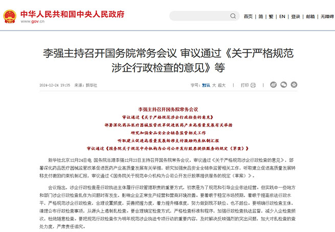 國務(wù)院總理李強12月23日主持召開國務(wù)院常務(wù)會議,審議通過《關(guān)于嚴(yán)格規(guī)范涉企行政檢查的意見》,部署深化藥品醫(yī)療器械監(jiān)管改革促進醫(yī)藥產(chǎn)業(yè)高質(zhì)量發(fā)展有關(guān)舉措,研究加強食品安全全鏈條監(jiān)管相關(guān)工作,聽取建立促進高質(zhì)量發(fā)展轉(zhuǎn)移支付激勵約束機制匯報,審議通過《國務(wù)院關(guān)于規(guī)范中介機構(gòu)為公司公開...