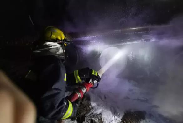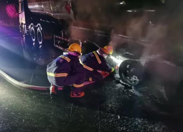 12月17日17時31分,東營市河口區(qū)孤島鎮(zhèn)315省道馬場西邊道路上一輛滿載32噸汽油罐車輪胎起火,油罐車南側100米處緊鄰加油、加氣站。一旦油罐泄露或爆炸造成大面積流淌火后果不堪設想。 接到報警后,河慶路消防救援站立即出動前往處置。消防員行進途中聯(lián)系報警人得知,剎車制動溫度過高導致油罐車后輪輪胎起火,慶幸的是車上無人員被困, 現(xiàn)場,著火油罐車底盤輪胎猛烈燃燒,時刻威脅著車上的油罐。 車體被包圍在火焰中產(chǎn)生濃烈煙霧,隨時可能被引燃爆炸。 因汽油儲罐為滿罐,多一分鐘燃燒就多一分危險,現(xiàn)場指揮員立即下達戰(zhàn)斗指令,指揮消防車輛?吭谏巷L方向60米處,并將消防員分為兩組,第一戰(zhàn)斗小組鋪設三盤水帶,出一支泡沫槍直撲起火部位,第二戰(zhàn)斗小組負責現(xiàn)場警戒、疏散周圍車輛。 經(jīng)過緊張救援,18時12分明火被成功撲滅。同時,消防員架設移動炮對車輛和罐體持續(xù)冷卻,并通知駕駛員聯(lián)系運輸車輛前來轉輸。經(jīng)過30分鐘的冷卻,油罐車體冷卻至常溫。