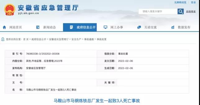 熱鬧的春節(jié)假期結(jié)束了,令人沒想到的是假期最后一天,安徽一煉鐵廠突發(fā)事故,致4人不幸遇難。 復(fù)工安全千萬不能兒戲! 據(jù)安徽省應(yīng)急管理廳通報(bào),2月6日上午,安徽馬鞍山市馬鋼煉鐵總廠一料倉(cāng)發(fā)生事故,致4人不幸遇難、1人受傷。 2月6日上午10時(shí)20分左右,馬鋼煉鐵總廠區(qū)域內(nèi)一料倉(cāng)本體漏灰,6名工作人員進(jìn)行搶修作業(yè)時(shí),灰斗本體突然開裂,大量脫硫灰冒出。工作人員被從四樓平臺(tái)沖至二樓平臺(tái),4人送醫(yī)搶救,其中3人搶救無效死亡,1人生命體征平穩(wěn);另1人手部輕微灼傷;1人被掩埋,17時(shí)被搜救出已無生命體征。 目前,事故原因正在調(diào)查分析中。