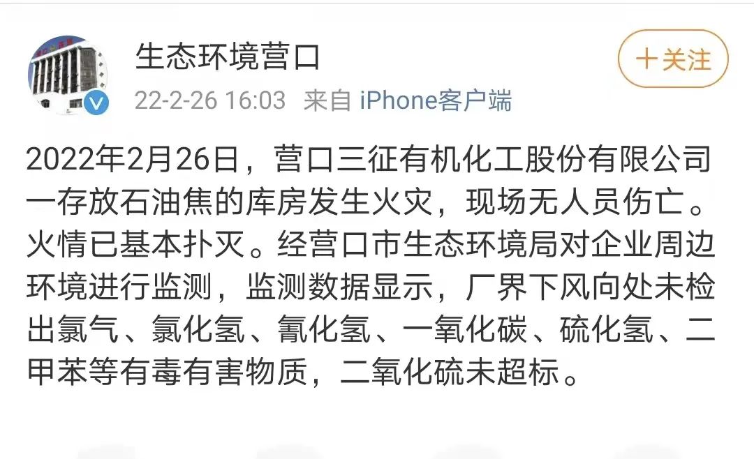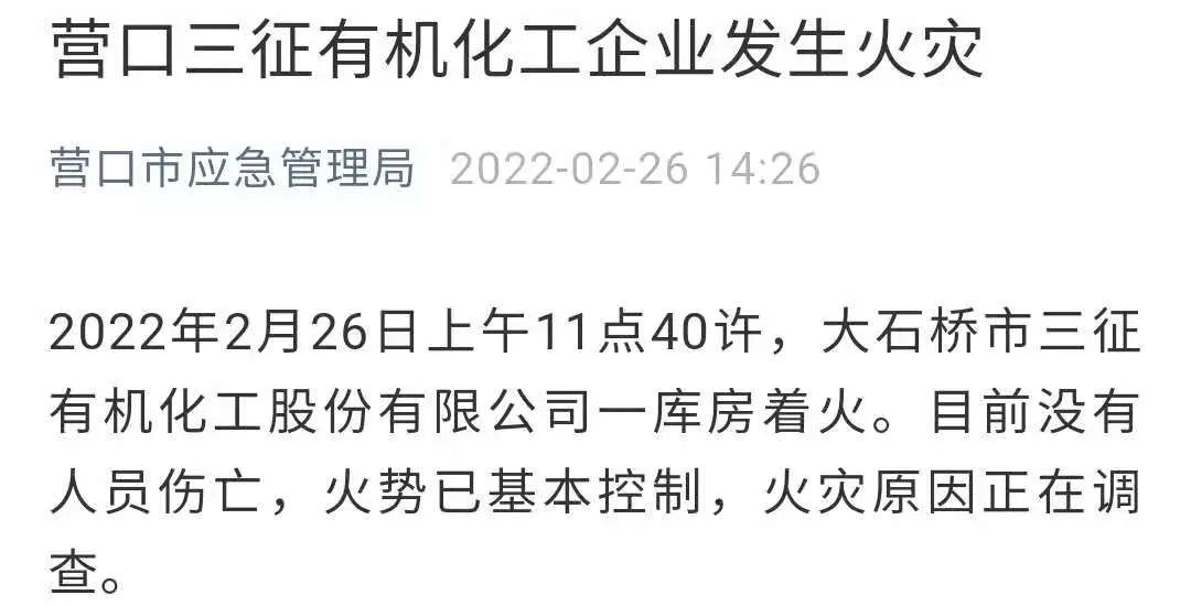 2022年2月26日上午11點(diǎn)40許,大石橋市三征有機(jī)化工股份有限公司一庫房著火。目前沒有人員傷亡,火勢(shì)已基本控制,火災(zāi)原因正在調(diào)查。 遼寧三征化學(xué)有限公司系三征有機(jī)化工股份有限公司的下屬公司。其官方網(wǎng)站信息顯示,該公司地址位于遼寧省大石橋市水源鎮(zhèn)黑英臺(tái)村,是國(guó)家農(nóng)藥定點(diǎn)生產(chǎn)企業(yè),是集原藥及制劑研發(fā)和生產(chǎn)于一體的現(xiàn)代化生產(chǎn)企業(yè),多年來專注于農(nóng)藥除草劑的開發(fā)應(yīng)用,擁有多種制劑產(chǎn)品,相繼開發(fā)了乳油、水劑、懸乳劑、油懸劑、微乳劑、可濕性粉劑、水分散粒劑等多種劑型,產(chǎn)品涵蓋了玉米、大豆、水稻、花生、甘蔗、和經(jīng)濟(jì)作物等多種除草劑品種60多個(gè),規(guī)格400多種,年生產(chǎn)能力原藥1萬噸,制劑3.5萬噸。 2月26日下午,記者多次撥打遼寧三征化學(xué)有限公司官方網(wǎng)站上公布的辦公電話,均顯示電話已關(guān)機(jī)。 大石橋市水源鎮(zhèn)鎮(zhèn)政府工作人員告訴記者,當(dāng)?shù)氐娜骰瘜W(xué)確實(shí)出了事故,目前有關(guān)部門的領(lǐng)導(dǎo)都在現(xiàn)場(chǎng)參與救援,但有無人員受傷等詳細(xì)情況他均不清楚。