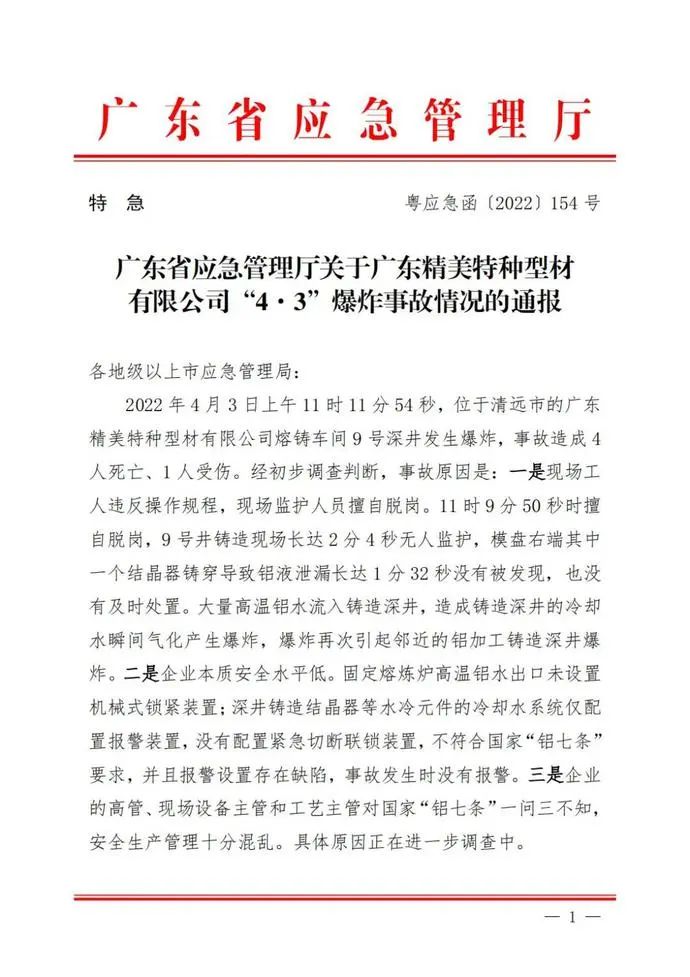 4月3日上午,廣東清遠(yuǎn)某特種型材有限公司熔鑄二號車間9號鑄造井發(fā)生爆炸事故。事故造成4人死亡、1人重傷,廠房嚴(yán)重?fù)p毀。 監(jiān)控視頻顯示,爆炸現(xiàn)場升起數(shù)米高的“蘑菇云”。 4月5日,清遠(yuǎn)市清城區(qū)應(yīng)急管理局通報(bào),經(jīng)現(xiàn)場初步判斷,直接原因?yàn)椋轰X棒在拉鑄過程中,鋁水泄漏到冷卻水池內(nèi)導(dǎo)致事故發(fā)生。 事故通報(bào)顯示,具體事故原因初步總結(jié)為: 一是現(xiàn)場工人違反操作規(guī)程,現(xiàn)場監(jiān)護(hù)人員擅自脫崗。 二是企業(yè)本質(zhì)安全水平低。 三是企業(yè)的高管、現(xiàn)場設(shè)備主管和工藝主管對國家“鋁七條”一問三不知,安全生產(chǎn)管理十分混亂。 有關(guān)善后工作正在進(jìn)行中,清遠(yuǎn)已成立事故調(diào)查組,正開展事故調(diào)查處理工作。