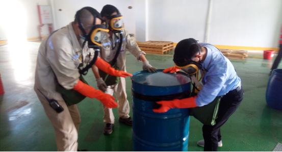 2、在應(yīng)急演練處置過程中,倉儲部作為應(yīng)急救援的主力軍,處置動(dòng)作迅速、到位,對防毒面具的穿戴掌握熟練。