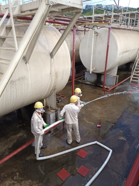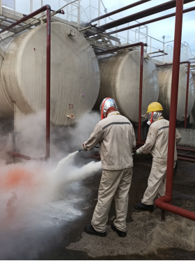 本次演練有薌城區(qū)應急局管理局5位領導全程觀摩指導,公司所有在崗人員參與,參與人員共39個人。應急救援隊伍分成滅火組、堵漏組、工藝組、事故洗消組、事故監(jiān)測組、消控組、搜救組、醫(yī)療救護及后勤保障組、安全警戒及疏散組等9個應急救援組。整個演練歷時22分鐘。演練過程圖片見附圖。