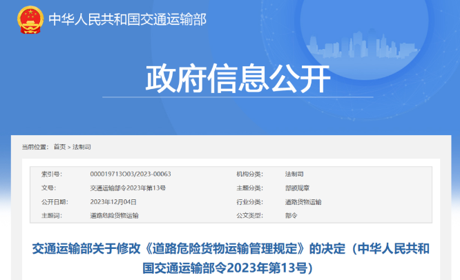 近日,國(guó)務(wù)院發(fā)布《關(guān)于修改和廢止部分行政法規(guī)的決定》(國(guó)務(wù)院令第764號(hào),以下簡(jiǎn)稱(chēng)《決定》),對(duì)《中華人民共和國(guó)道路運(yùn)輸條例》作出修改。 為落實(shí)《決定》要求,交通運(yùn)輸部對(duì)《道路危險(xiǎn)貨物運(yùn)輸管理規(guī)定》進(jìn)行了相應(yīng)修改,取消了“對(duì)道路危險(xiǎn)貨物運(yùn)輸企業(yè)或者單位不按照規(guī)定隨車(chē)攜帶道路運(yùn)輸證行為的罰款”。 此外,依據(jù)國(guó)家機(jī)構(gòu)改革部署,對(duì)部分機(jī)構(gòu)名稱(chēng)進(jìn)行了相應(yīng)修改;依據(jù)近兩年新頒布實(shí)施的《中華人民共和國(guó)安全生產(chǎn)法》,對(duì)處罰規(guī)定進(jìn)行了梳理和調(diào)整,以與上位法保持一致;根據(jù)近兩年標(biāo)準(zhǔn)修改、廢止情況,對(duì)引用的標(biāo)準(zhǔn)名稱(chēng)進(jìn)行了相應(yīng)更新。 詳情如下: 一、將第三條中的“《危險(xiǎn)貨物品名表》(GB 12268)”、第四條中的“《危險(xiǎn)貨物分類(lèi)和品名編號(hào)》(GB 6944)”“《危險(xiǎn)貨物品名表》(GB 12268)”“《危險(xiǎn)貨物運(yùn)輸包裝通用技術(shù)條件》(GB 12463)”修改為“《危險(xiǎn)貨物道路運(yùn)輸規(guī)則》(JT/T 617)”。 二、將第七條第二款修改為:“縣級(jí)以上地方人民政府交通運(yùn)輸主管部門(mén)(以下簡(jiǎn)稱(chēng)交通運(yùn)輸主管部門(mén))負(fù)責(zé)本行政區(qū)域的道路危險(xiǎn)貨物運(yùn)輸管理工作”;刪去第三款。 三、將第九條、第十一條中的“安全生產(chǎn)監(jiān)督管理部門(mén)”修改為“應(yīng)急管理部門(mén)”。 四、將第十條中的“工商行政管理機(jī)關(guān)”修改為“市場(chǎng)監(jiān)督管理部門(mén)”。 五、刪去第八條第一項(xiàng)第6目中的“質(zhì)量檢驗(yàn)部門(mén)”、第二十三條、第二十四條第三款中的“質(zhì)量檢驗(yàn)部門(mén)出具的”。 六、將第三十六條、第四十四條中的“《汽車(chē)運(yùn)輸危險(xiǎn)貨物規(guī)則》(JT 617)”“《汽車(chē)運(yùn)輸、裝卸危險(xiǎn)貨物作業(yè)規(guī)程》(JT 618)”修改為“《危險(xiǎn)貨物道路運(yùn)輸規(guī)則》(JT/T 617)”。 七、第四十八條改為第四十七條,將其中的“安全生產(chǎn)監(jiān)督管理部門(mén)和環(huán)境保護(hù)、衛(wèi)生主管部門(mén)”修改為“應(yīng)急管理部門(mén)和生態(tài)環(huán)境、衛(wèi)生健康主管部門(mén)”。 八、第五十六條改為第五十五條,將其中的“有違法所得的”修改為“違法所得超過(guò)2萬(wàn)元的”。 九、刪去第五十九條。 十、第六十一條改為第五十九條,修改為:“違反本規(guī)定,道路危險(xiǎn)貨物運(yùn)輸企業(yè)或者單位未配備專(zhuān)職安全管理人員的,由交通運(yùn)輸主管部門(mén)依照《中華人民共和國(guó)安全生產(chǎn)法》的規(guī)定進(jìn)行處罰! 十一、將“道路運(yùn)輸管理機(jī)構(gòu)”“道路危險(xiǎn)貨物運(yùn)輸管理機(jī)構(gòu)”“縣級(jí)以上道路運(yùn)輸管理機(jī)構(gòu)”統(tǒng)一修改為“交通運(yùn)輸主管部門(mén)”。 條文序號(hào)和個(gè)別文字作相應(yīng)修改。 本決定自公布之日起施行。 《道路危險(xiǎn)貨物運(yùn)輸管理規(guī)定》根據(jù)本決定作相應(yīng)修正,重新公布。