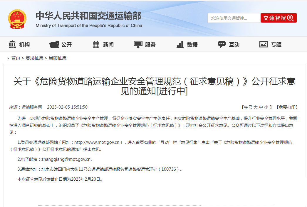 為進一步規(guī)范危險貨物道路運輸企業(yè)安全生產(chǎn)管理,督促企業(yè)落實安全生產(chǎn)主體責(zé)任,夯實危險貨物道路運輸安全生產(chǎn)基礎(chǔ),提升行業(yè)安全管理水平,近日,交通運輸部運輸服務(wù)司在深入調(diào)查研究的基礎(chǔ)上,組織起草了《危險貨物道路運輸企業(yè)安全管理規(guī)范(征求意見稿)》,現(xiàn)向社會公開征求意見。根據(jù)當(dāng)前危險貨物道路運輸企業(yè)管理暴露出的一些問題和短板,交通運輸部借鑒浙江省、江蘇省、廣東省等地經(jīng)驗,制定《危險貨物道路運輸企業(yè)安全管理規(guī)范》,對于督促指導(dǎo)企業(yè)嚴格執(zhí)行有關(guān)法律法規(guī)和標準規(guī)范,落實安全生產(chǎn)主體責(zé)任,實現(xiàn)“管理有規(guī)范、作業(yè)有標準、操作有程序、過程有記錄、結(jié)果有考核”,防范化解重大風(fēng)險、遏制重特大事故發(fā)生具有重要意義。圍繞安全問題,新規(guī)在多方面進行了明確的規(guī)定,如在貨物運輸裝卸貨上,規(guī)定駕駛員和押運人員不得違反規(guī)定擅自從事卸貨作業(yè)活動,杜絕因不當(dāng)造作引發(fā)安全問題。對于危貨電子運單,新規(guī)也做出了明確規(guī)定,強調(diào)電子運單的規(guī)范制作性,如駕駛員和押運員信息必須與電子運單保持一致,貨物信息填寫必須準確,避免有軌跡無運單等等。在監(jiān)管方面,規(guī)定危貨運輸企業(yè)應(yīng)當(dāng)建立具有行駛記錄、衛(wèi)星定位功能的衛(wèi)星定位裝置(以下簡稱衛(wèi)星定位裝置)安裝、使用及維護制度。危貨車輛動態(tài)監(jiān)控數(shù)據(jù)應(yīng)當(dāng)至少保存6個月,違法駕駛信息及處理情況應(yīng)當(dāng)至少保存36個月。