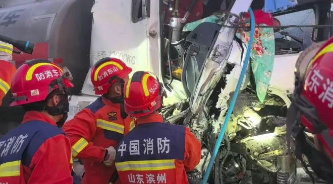 5月15日3時(shí)49分,山東濱州市消防救援支隊(duì)指揮中心接到報(bào)警稱,沾化區(qū)340國道徒駭河大橋紅綠燈附近發(fā)生一起車禍?zhǔn)鹿剩瑑扇吮焕,接警后,沾化?jīng)濟(jì)開發(fā)區(qū)特勤消防救援站立即出動(dòng)消防救援人員趕赴現(xiàn)場(chǎng)處置。消防救援人員到達(dá)現(xiàn)場(chǎng)后發(fā)現(xiàn),事故現(xiàn)場(chǎng)為一輛油罐車追尾一輛半掛車,油罐車駕駛室嚴(yán)重變形,車頭被擠扁,司機(jī)及押運(yùn)人員分別被變形的操作臺(tái)壓住右腳和左腳,無法脫困。 了解情況后,指揮員立即下達(dá)救援命令:警戒組與現(xiàn)場(chǎng)交警部門協(xié)同合作,對(duì)事故現(xiàn)場(chǎng)實(shí)施交通管制與引導(dǎo);救援組立即展開行動(dòng),決定破拆副駕駛室車門率先對(duì)押運(yùn)人員實(shí)施救援,首先利用無齒鋸對(duì)車門鉸鏈進(jìn)行切割,但鉸鏈為鑄鐵材質(zhì),一時(shí)難以割斷。 為節(jié)省救援時(shí)間,消防救援人員嘗試用拖車對(duì)油罐車駕駛室右側(cè)A柱進(jìn)行拖拽牽引,無奈效果不明顯。隨后,消防救援人員再次使用液壓破拆工具組對(duì)副駕駛室車門進(jìn)行破拆,車門被成功打開后,借助液壓擴(kuò)張鉗不斷擴(kuò)張押運(yùn)人員左腳的被卡位置,增大救援空間,經(jīng)過1個(gè)多小時(shí)的緊張救援,押運(yùn)人員被成功救出,交由現(xiàn)場(chǎng)等候的120醫(yī)護(hù)人員,送往醫(yī)院接受治療,同時(shí),被困司機(jī)的右腳也拔了出來,自行由駕駛室車門脫困,現(xiàn)場(chǎng)交通恢復(fù)正常通行。事后,從被困司機(jī)處了解到,事發(fā)時(shí)霧太大,加之前車尾燈損壞不亮,導(dǎo)致在紅綠燈路口剎車不及造成追尾。