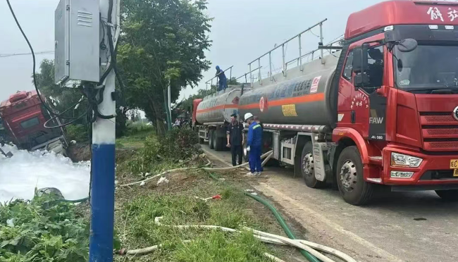 6月27日凌晨1時許,一輛滿載33噸汽油的山東籍危險品罐車行駛至蚌埠市淮上區(qū)沫河口洪廟村路段時,因夜間降雨路滑發(fā)生側翻,導致罐體輕微油品泄漏。1時43分,市交通運輸局在獲悉事故并了解基本情況后,立即啟動應急處置,9名救援人員攜2臺核載20噸專業(yè)轉運車及應急裝備趕赴現(xiàn)場。 3時,負責轉運的車輛及人員抵達現(xiàn)場,并聯(lián)合消防、應急部門勘查險情,制定“防爆監(jiān)測-油品轉運環(huán)境防護”一體化的處置方案。安排科學轉運作業(yè),采用防靜電抽油設備實施倒罐,全程監(jiān)控油氣濃度,確保無次生風險。當日14時05分完成全部油品安全轉運,泄漏油品基本實現(xiàn)“零污染擴散”。應急響應啟動至救援車輛、人員和裝備抵達現(xiàn)場僅需77分鐘,12小時內(nèi)完成高危油品轉運,交通、消防、應急及企業(yè)等多方實現(xiàn)聯(lián)動“零壁壘”。