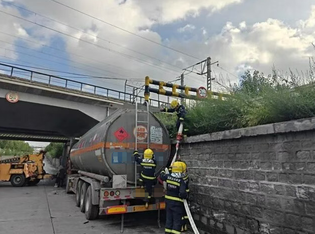 近日,山東淄博市臨淄區(qū)馮北路立交橋下發(fā)生一起三車連環(huán)碰撞事故,其中一輛為裝載33噸汽油的危險(xiǎn)品罐車,情況十分緊急。齊魯石化隊(duì)迅速出動(dòng)2輛消防車、8名隊(duì)員趕赴現(xiàn)場(chǎng),發(fā)現(xiàn)其中一輛載有33噸汽油的槽車在碰撞后緊貼立交橋一側(cè)橋墩停下,而立交橋上方就是繁忙的膠濟(jì)鐵路。 汽油槽車雖暫未泄漏,但變形嚴(yán)重,如強(qiáng)行拖離,存在罐體破裂導(dǎo)致汽油泄漏的危險(xiǎn),一旦引發(fā)火災(zāi)或爆炸,后果不堪設(shè)想。根據(jù)現(xiàn)場(chǎng)情況,齊魯石化隊(duì)隊(duì)員與趕到的地方交警共同研究制定處置方案,由齊魯石化隊(duì)對(duì)槽車進(jìn)行冷卻保護(hù),保障拖車過(guò)程罐體安全,交警實(shí)施臨時(shí)管制,杜絕現(xiàn)場(chǎng)一切火源。隊(duì)員們立即行動(dòng),就近在立交橋一側(cè)非機(jī)動(dòng)車車道鋪設(shè)水帶干線,對(duì)槽車罐壁進(jìn)行泡沫噴射和灑水降溫,防止拖車過(guò)程中,罐體與墻壁摩擦、碰撞產(chǎn)生靜電和火花引發(fā)危險(xiǎn)。在現(xiàn)場(chǎng)人員的密切配合下,油罐車被安全拖離事故現(xiàn)場(chǎng)。